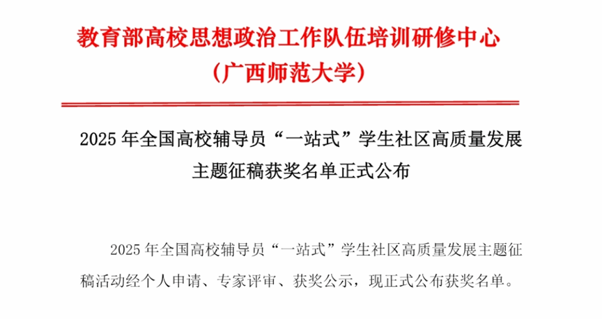 近日,2025年全国高校辅导员“一站式”学生社区高质量发展主题征稿结果揭晓,国际教育学院辅导员杨婕老师的案例《跨越国界的守护:国际学生心理危机中的“1+N”守护联盟》荣获二等奖。