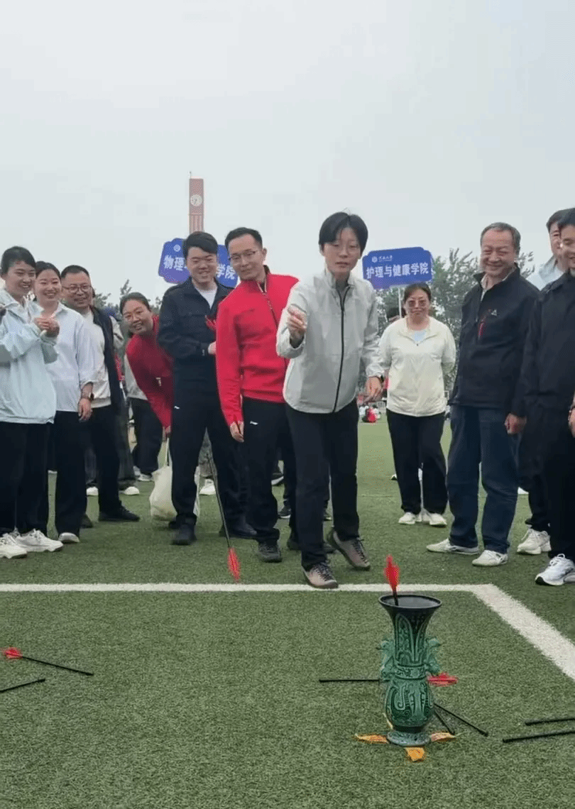 趣味项目中大家尽情挥洒活力,尽显团结协作、积极向上的精神风貌。跳绳比赛现场气氛热烈,老师们身姿轻盈,随着跳绳翻飞起落。飞盘投掷比赛,老师们凝神聚力,摆臂、发力、投掷一气呵成,彩色飞盘在空中划出流畅弧线。投壶现场氛围文雅又热闹,老师们手持箭矢,屏息瞄准壶口,轻缓投掷。有人一击即中引来阵阵喝彩,有人屡试不中心态依旧轻松,彼此打趣鼓劲。袋鼠跳比赛更是热闹非凡,成为国际学生们的欢乐舞台。大家套上布袋化身“袋鼠”,双手紧紧抓住袋沿,双腿并拢奋力向前跳跃。不同肤色的身影在赛道上蹦跳穿梭,动作憨态可掬又充满活力。赛场边加油声、欢笑声不断,有人步伐轻快领先,有人稍显踉跄却依旧坚持,全程洋溢着热情与朝气,在趣味比拼中尽情释放活力,也真切感受到集体运动的快乐。